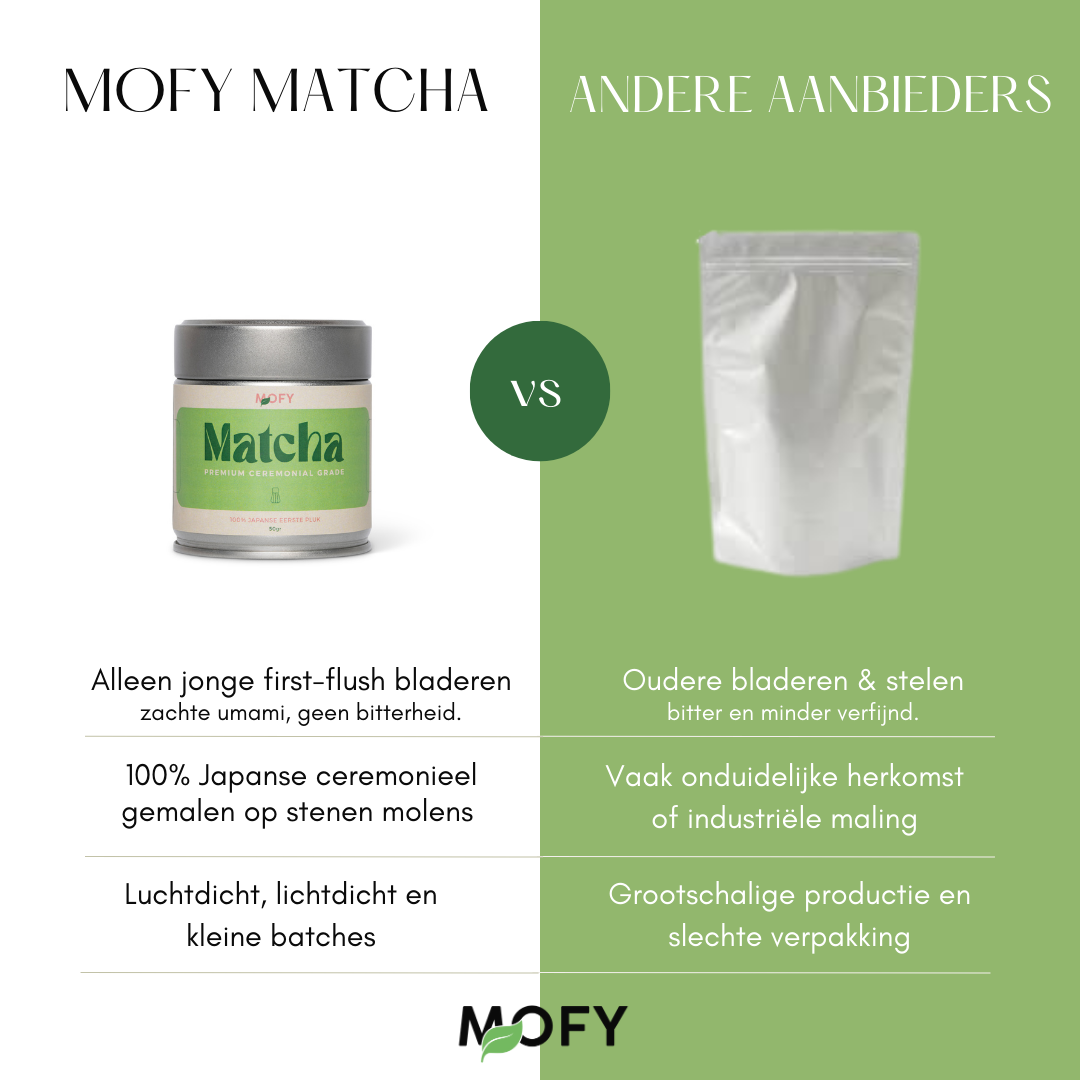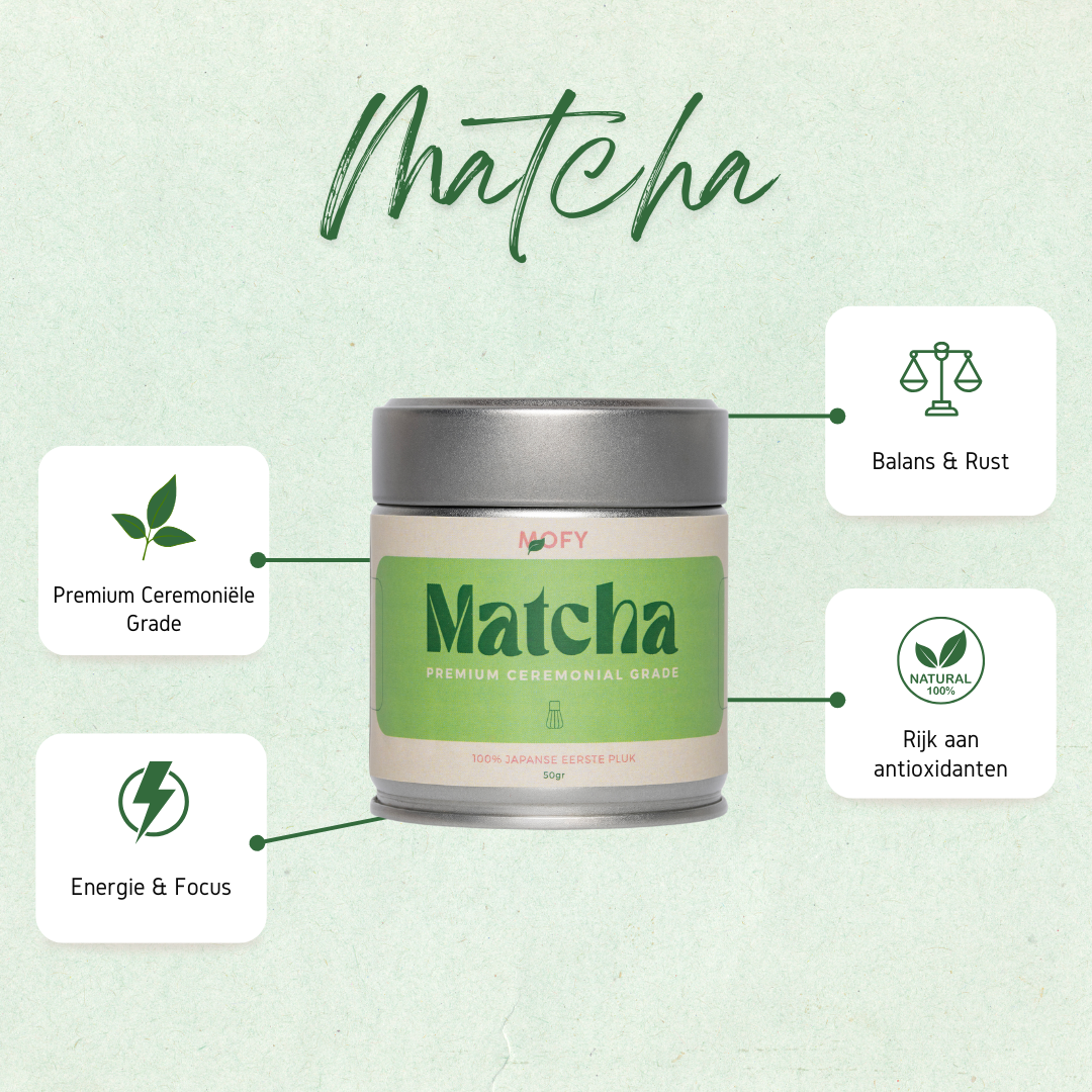 MOFY Matcha geeft je lichaam en geest een natuurlijke energieboost zonder de crash van koffie. Dit komt door de unieke combinatie van cafeïne (voor focus en energie) en L-theanine (voor rust en balans). Zo voel je je alert én ontspannen tegelijk.