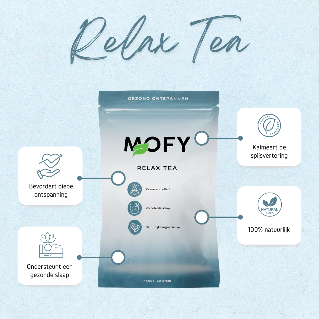 De Relax Tea is een natuurlijke thee die is samengesteld om te helpen ontspannen na een lange dag. Het bevat rustgevende ingrediënten zoals citroenmelisse, valeriaan en Sint-janskruid, die zowel je lichaam als geest kalmeren en kunnen helpen bij het bevorderen van een goede nachtrust.